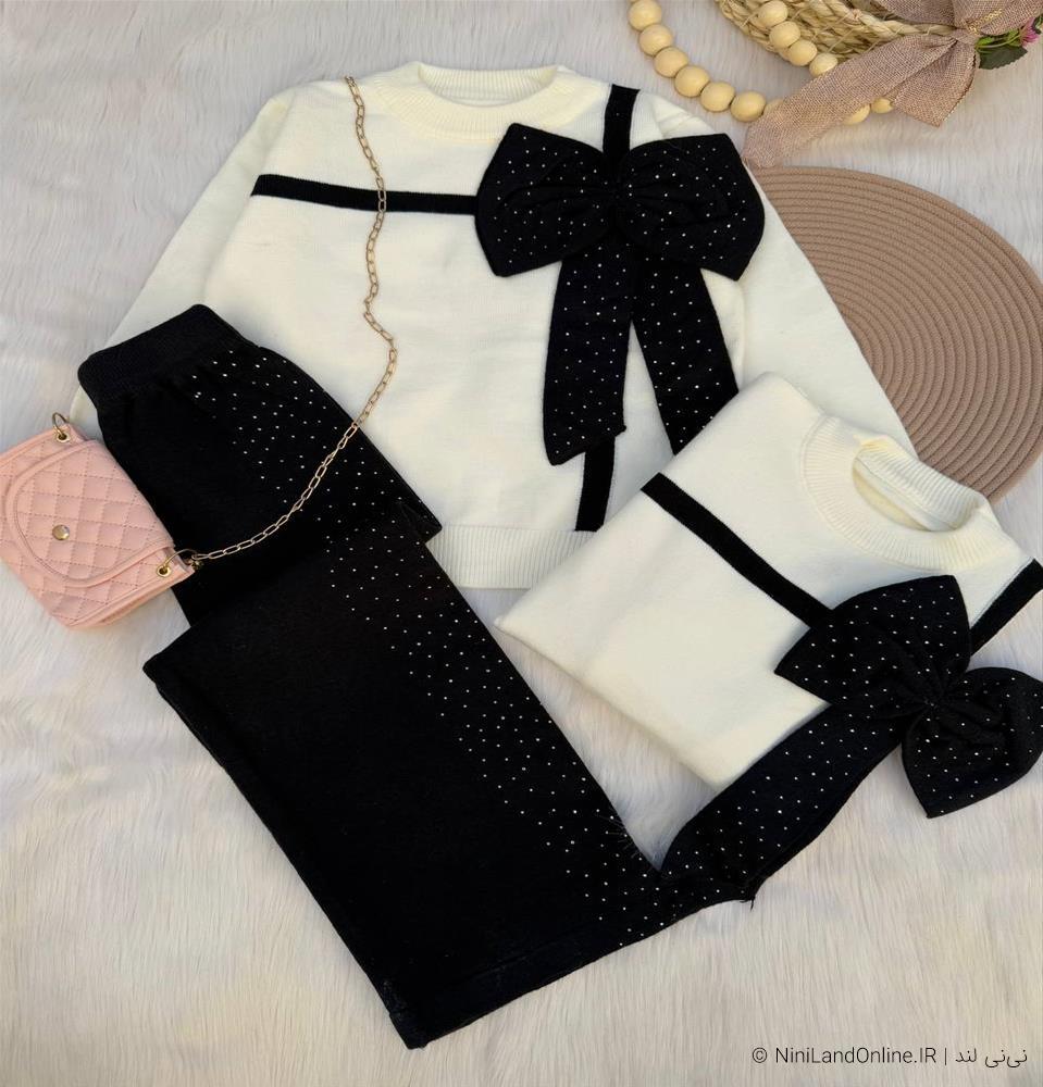دو تیکه بلوز شلوار بافت طرح پاپیون نگینی کد 8088